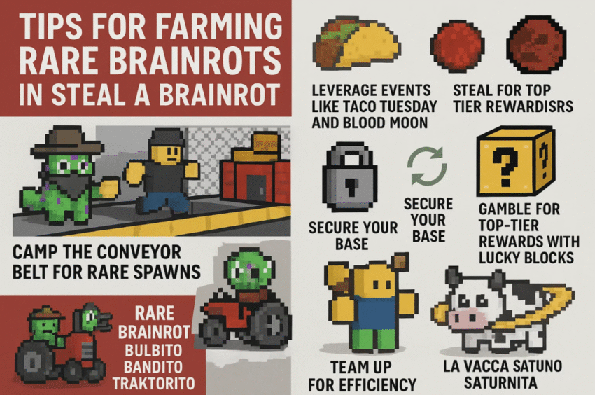Farming rare items in Steal A Brainrot is a thrilling mix of strategy, patience, and a little bit of chaos. Whether you’re camping the conveyor for cheap Steal A Brainrot Brainrots, hunting Secret Brainrots during events, or pulling off daring heists, the key is to stay sharp and adapt to the server’s vibe. My personal favorite spot is the conveyor during Taco Tuesday on a private server—it’s less hectic, and the rewards are worth the grind. What’s your go-to farming strategy? Drop your thoughts in the comments and let’s swap tips to dominate the Brainrot leaderboard!